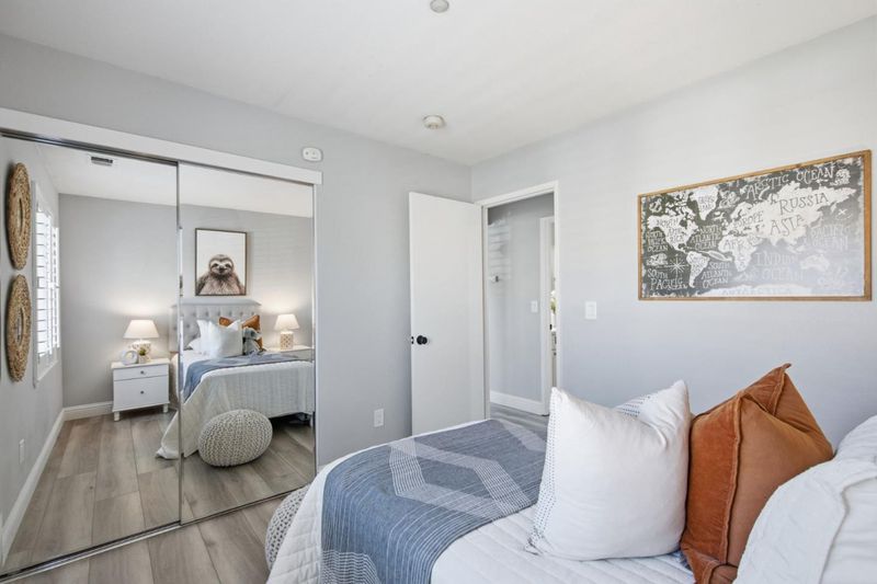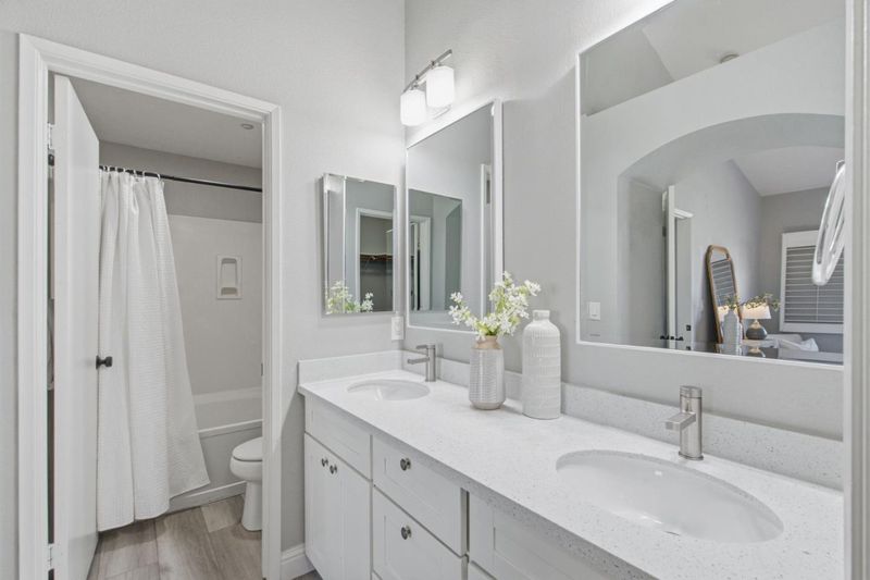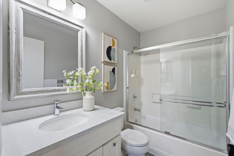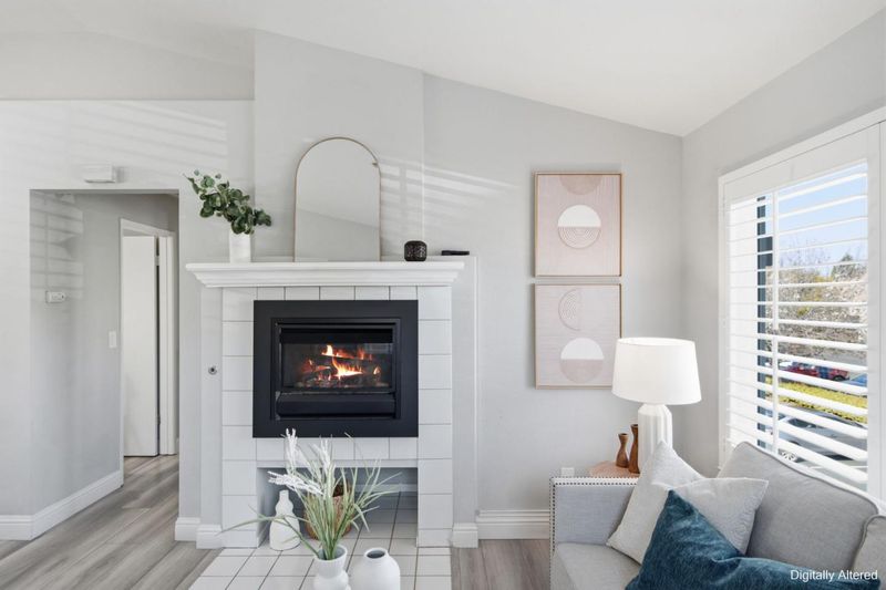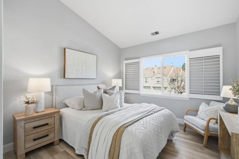 Rarely available move-in ready corner unit with private stairway entry in a popular community of NSJ. This home features vaulted ceilings and abundant natural light, complemented by double-paned windows, plantation shutters & East facing front door. Live like a townhome! The living room showcases a premium Valor fireplace and flows seamlessly into the dining area and kitchen. The kitchen features quartz countertops, cabinetry, SS appliances incl a gas range, a high-performance range hood, and recessed lighting. The primary suite offers vaulted ceilings, a walk-in closet, & an ensuite bath with dual vanities. Additional highlights incl newer flooring throughout & in unit washer and dryer, updated HVAC for year-round comfort. Ideally positioned away from the community refuse collection area, the home offers added privacy while remaining close to the community swimming pool and greenbelt. Parking includes a single-car attached garage with newly painted walls, 1 permit parking spot, and nearby st parking. Quick access to Hwy 237, 880 & 101, VTA light rail & SJ Intl Airport. Walking distance to the Lower Guadalupe River Trail, ideal for walking, running, biking, and dog walking. Convenient commute to major tech campuses incl Google Tasman, NVDA, Amazon, and future Apple NSJ campus.