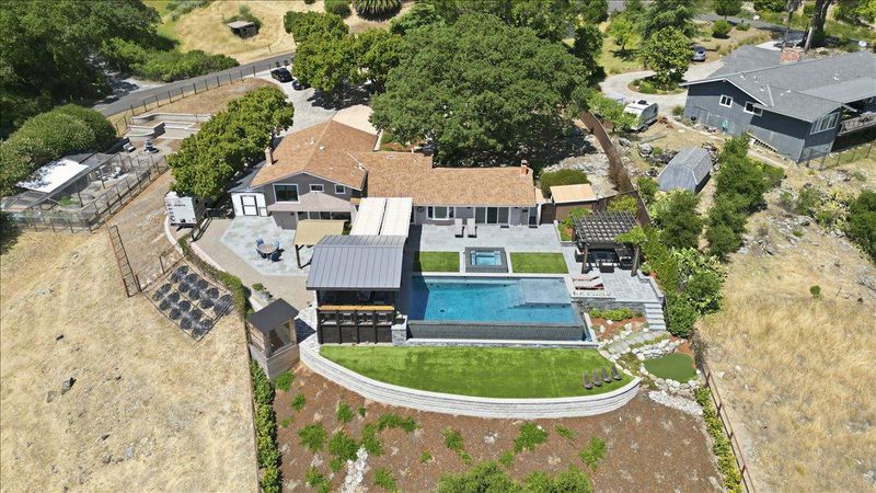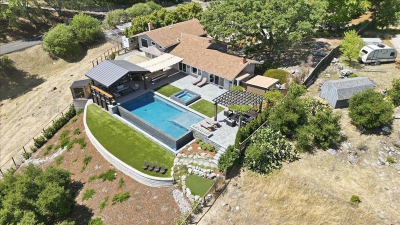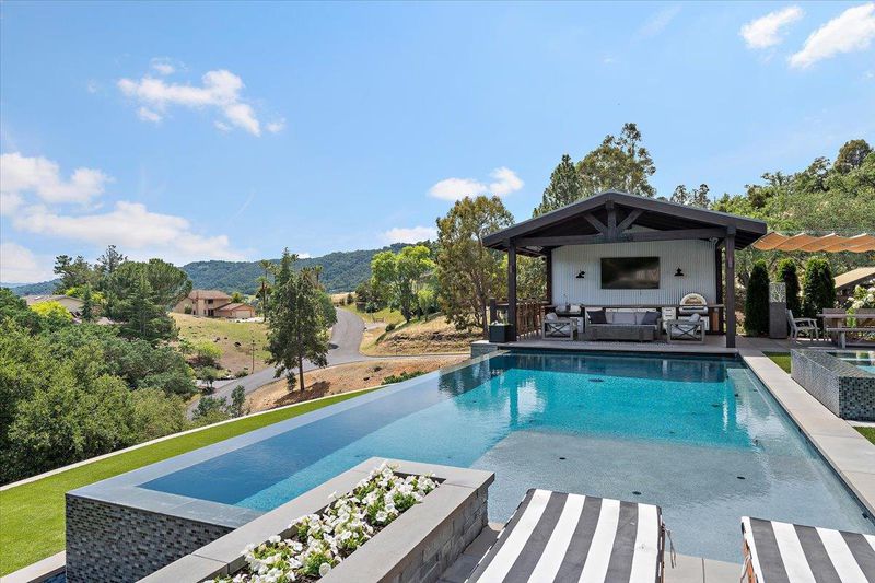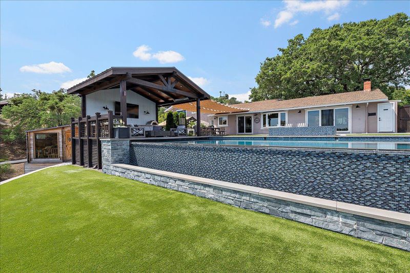 A property like this is almost impossible to find. Resort-style living with sweeping hill views, an infinity-edge pool, and multiple outdoor spaces designed for unforgettable entertaining & everyday living. This updated 4bd/3.5ba tri-level home blends comfort and style with LVP flooring, crown moulding, recessed lighting, open beam ceilings in the living room, and 2-fireplaces. The remodeled kitchen features quartz counters, S/S appliances, double ovens, gas cooktop, and a breakfast bar/island. The spacious primary suite offers a walk-in closet with professionally installed organizer and an updated bath with separate soaking tub and walk-in shower. Step outside to a true entertainers yard. Your own private retreat featuring: 2 golf tee boxes, putting green, outdoor kitchen complete with refrigerators, ice maker, BBQ, pizza oven, two pergolas, and a built-in fire pit. The infinity-edge pool with solar pool heating system and spa create a stunning focal point, while multiple seating areas are perfectly positioned to take in the sweeping hill views. Fully landscaped with garden area and chicken coop. Additional features include: dual pane windows, newer HVAC (~2 yrs), pool solar, reverse osmosis filter, Bluetooth-enabled attic fans, and a sauna. Opportunities like this are rare.