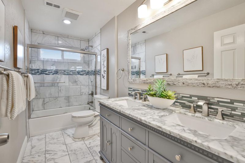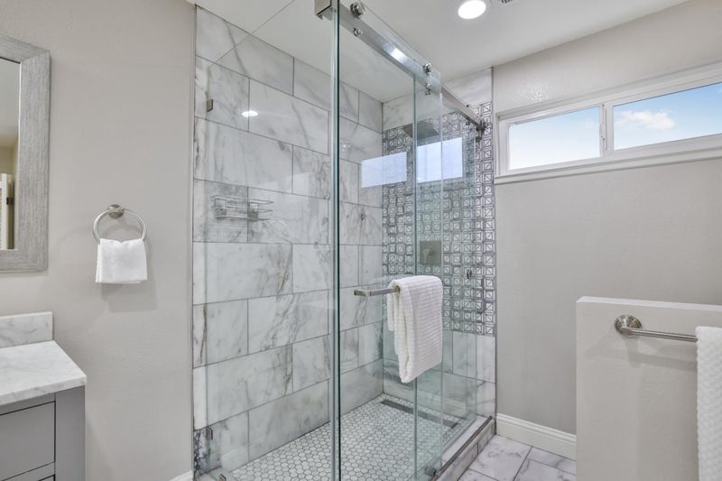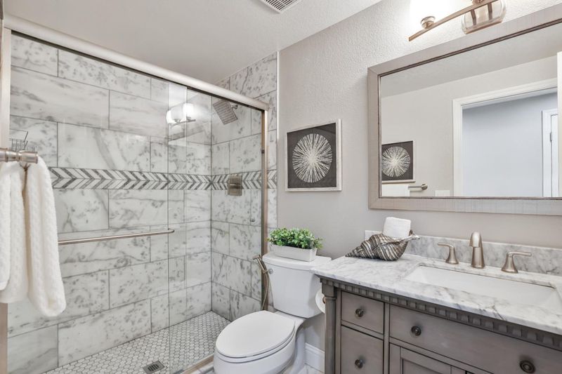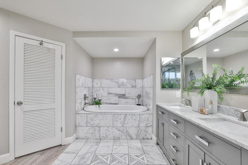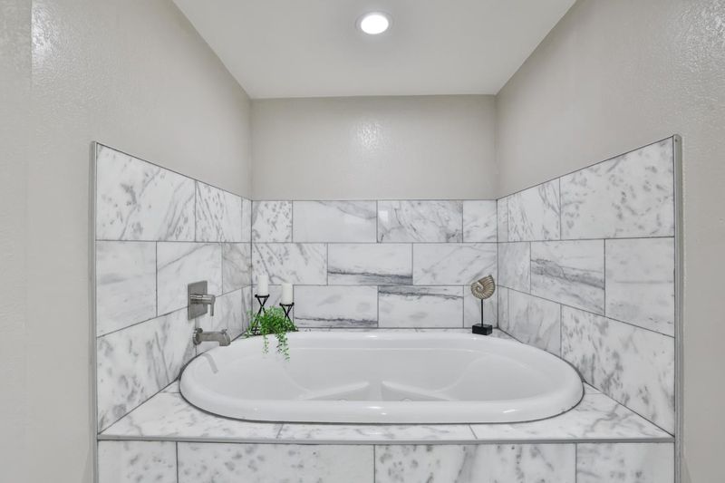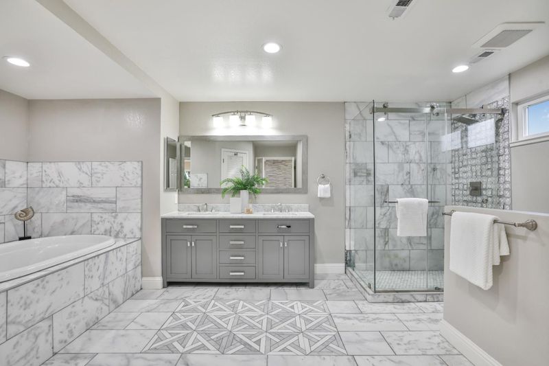 Double Sinks, Full on Ground Floor, Marble, Primary - Stall Shower(s), Shower over Tub - 1, Stall Shower, Tile, Tub with Jets, Updated Bath
